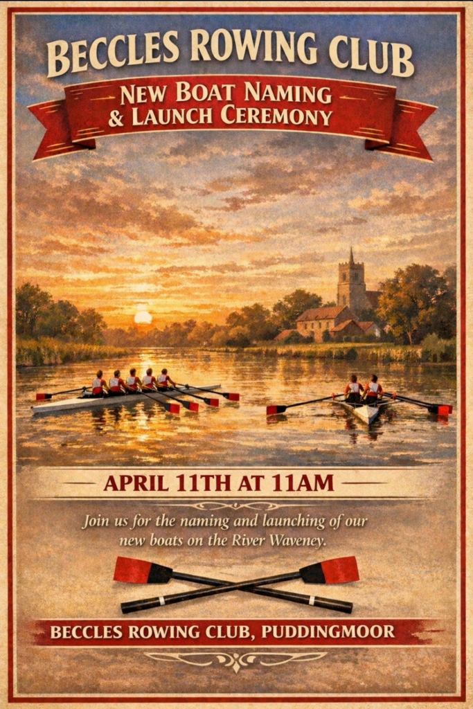 On April 11th 2026 @ 11am the club will be hosting a celebration and launch event for the brand new coxed quad and double which they were able to buy with the funds raised – joining the club fleet on The Waveney river.